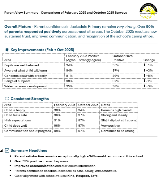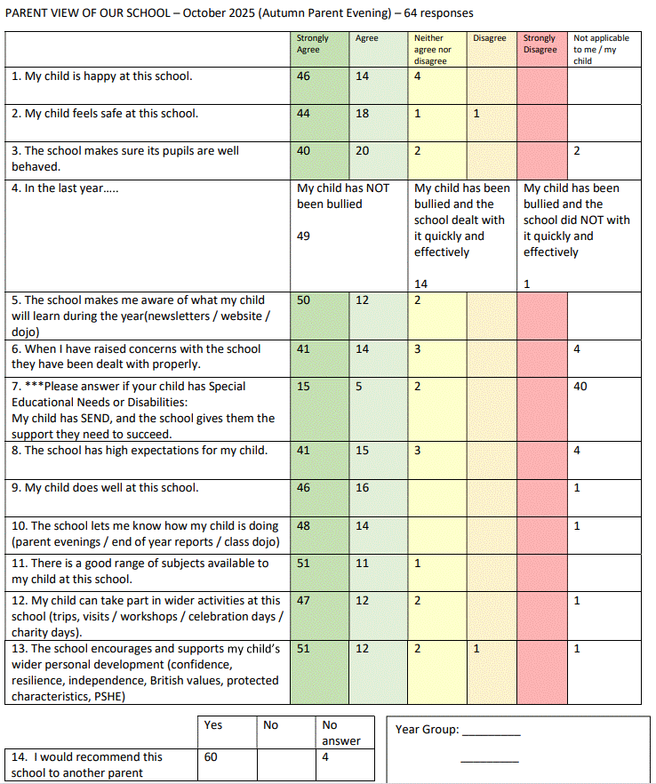 Our parents and carers are exceptionally important to us and their opinions matter and help us to shape our provision and offer for the children. We offer 2 parent evenings a year (Autumn and Spring) and provide a full written annual report in the Summer term. During the Autumn and Spring parent evenings, we ask parents & carers to share their view so that we can review what is working well and areas we may need to consider or strengthen as a school.